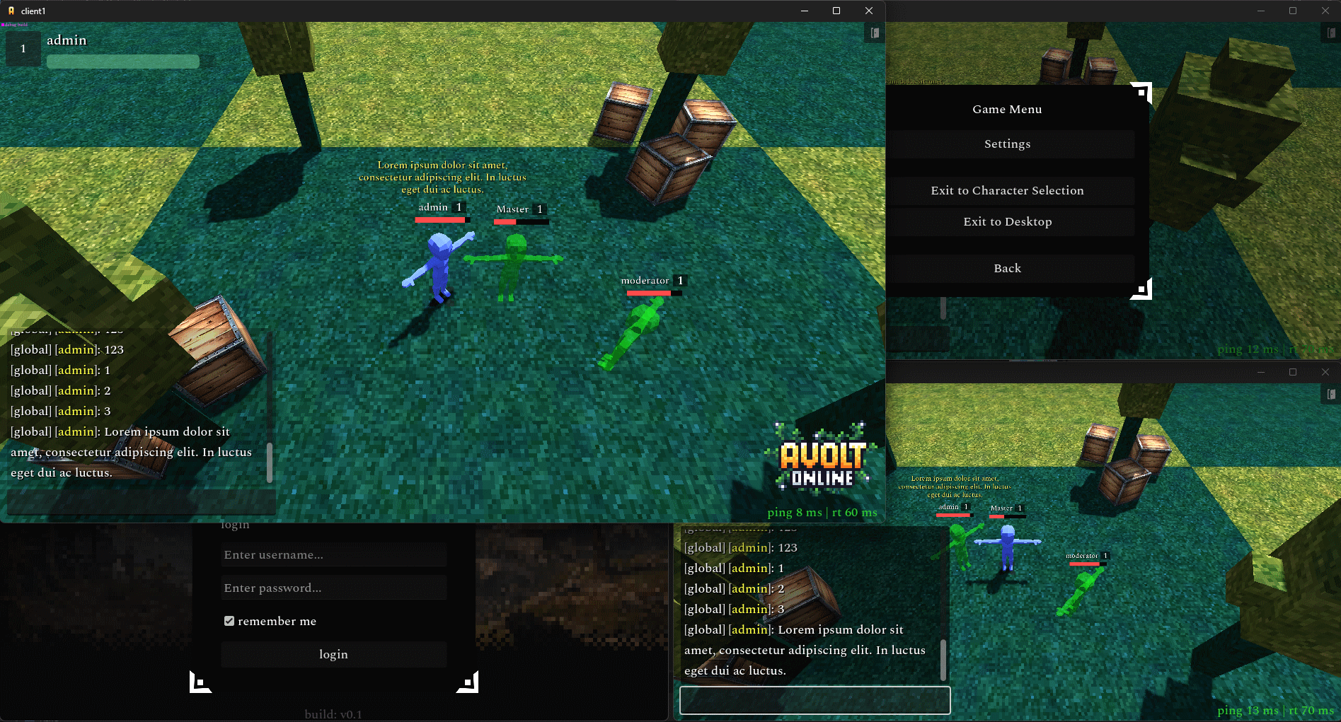 This is my hobby experiment in creating an MMO game. Many years ago, before I became a backend developer, I tried to implement a project under the name Avolt Online. Now I have started a new project with the same name.
